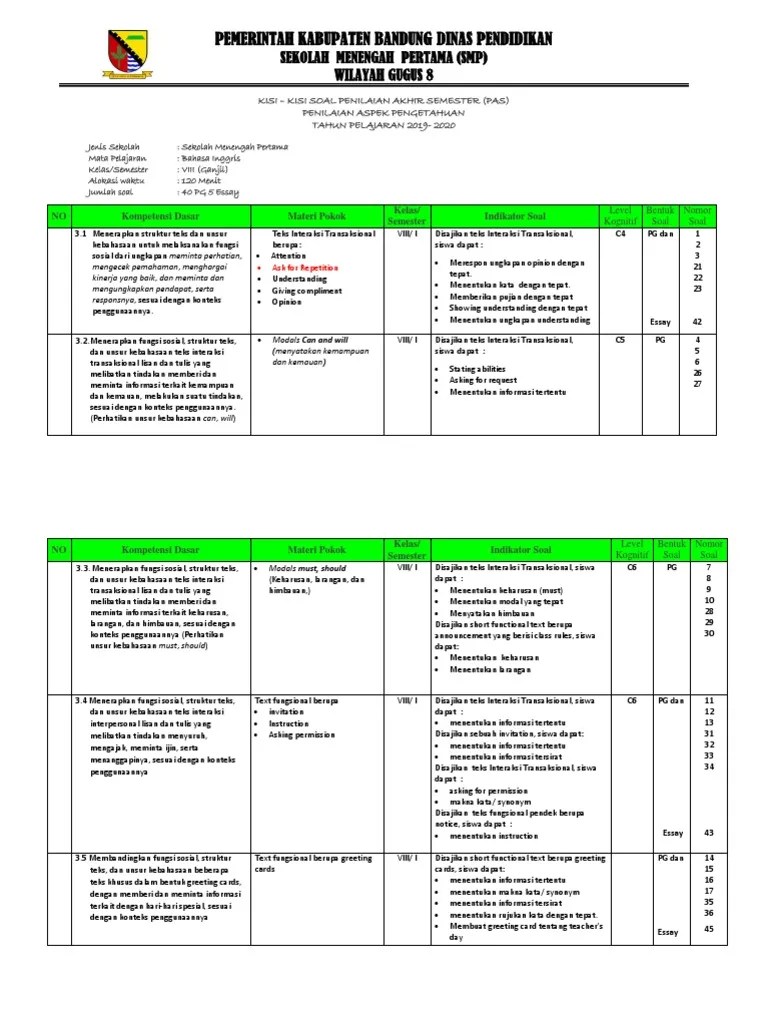 Untuk soal pat bahasa inggris kelas 7 dan 8 ini terdiri dari 50 soal yang semuanya adalah pilihan ganda(multiple choice). Kisi kisi beserta soal pts bahasa inggris kelas 8. Smp islam pb soedirman bekasi. Soal uts ulangan tengah semester 2 genap kelas 8 viii smp mts. 20201104 kisi kisi soal prakarya kelas 8 semester 2 dan kunci jawabancontoh soal beserta jawaban yang .